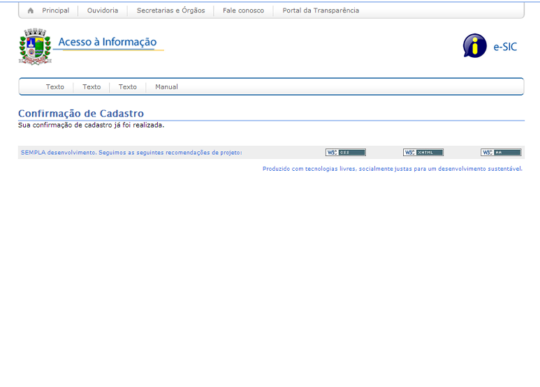 5. O link que o solicitante clicou no passo anterior irá redirecioná-lo (em nova janela) para a página confirmação de cadastro(figura abaixo);