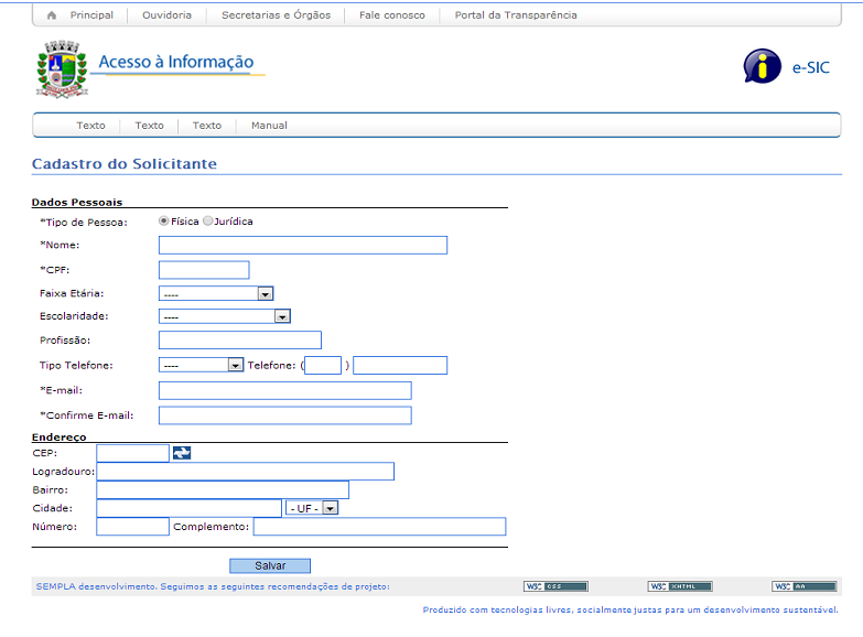 2. A tela seguinte é a de cadastro do solicitante, nela o usuário irá preencher os dados pessoais e em seguida clicar no botão salvar para que o seu cadastro seja efetuado (figura abaixo);