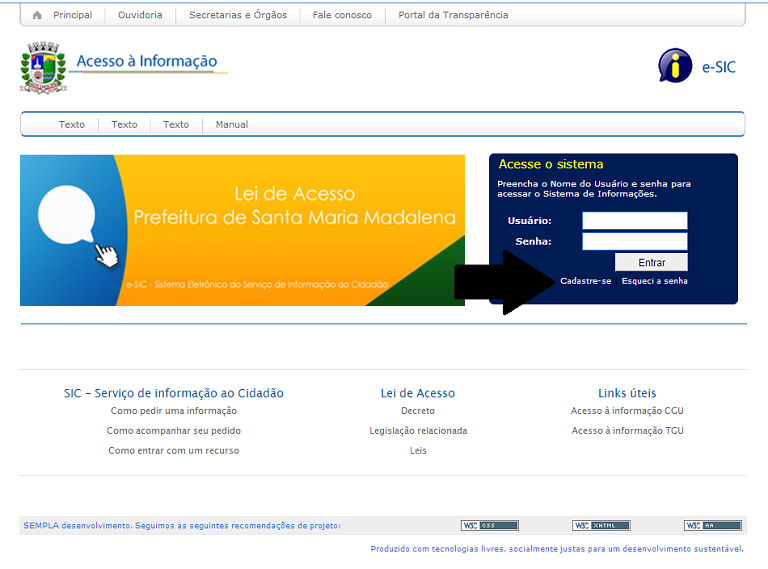 1. Entre na página do Lei de Acesso e clique no link "Cadastre-se", localizado à direita da página, dentro da caixa de login (figura abaixo);